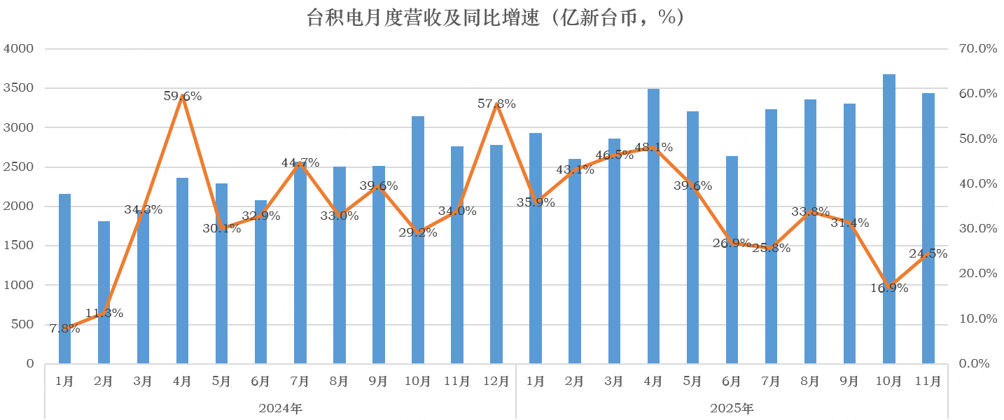 从收入上看,台积电11月营收3436亿新台币,同比增长24.5%,为史上营收第三高的月份!