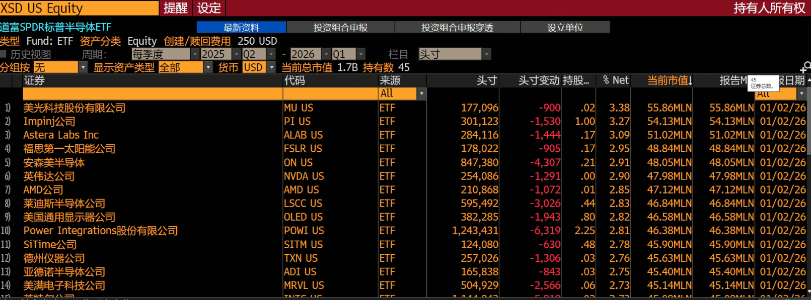 半导体第三大ETF是 $SPDR S&P Semiconductor ETF(XSD)$ ,从规模上看,只有17亿美元,和前面两位老大哥难以匹敌,但持仓更加分散,目前共持有60只标的,远高于SMH的26只、SOXX的32只。而且,XSD第一大持仓股是美光: