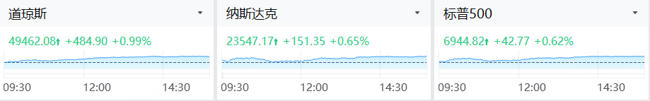 美东时间周二,美股三大指数全线收涨,其中道指、标普500指数均创历史新高。截至收盘,道指涨484.90点,涨幅为0.99%,报49462.08点;纳指涨151.35点,涨幅为0.65%,报23547.17点;标普500指数涨42.77点,涨幅为0.62%,报6944.82点。