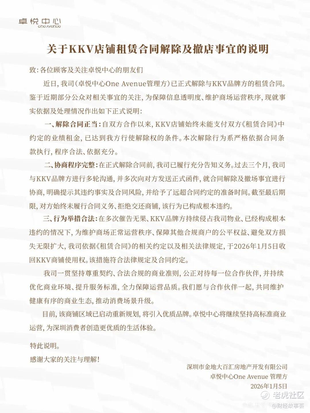上述声明披露,因业绩不佳导致“实质性违约”,卓悦中心管理方已单方面与KKV解除合同,清退收回店铺。