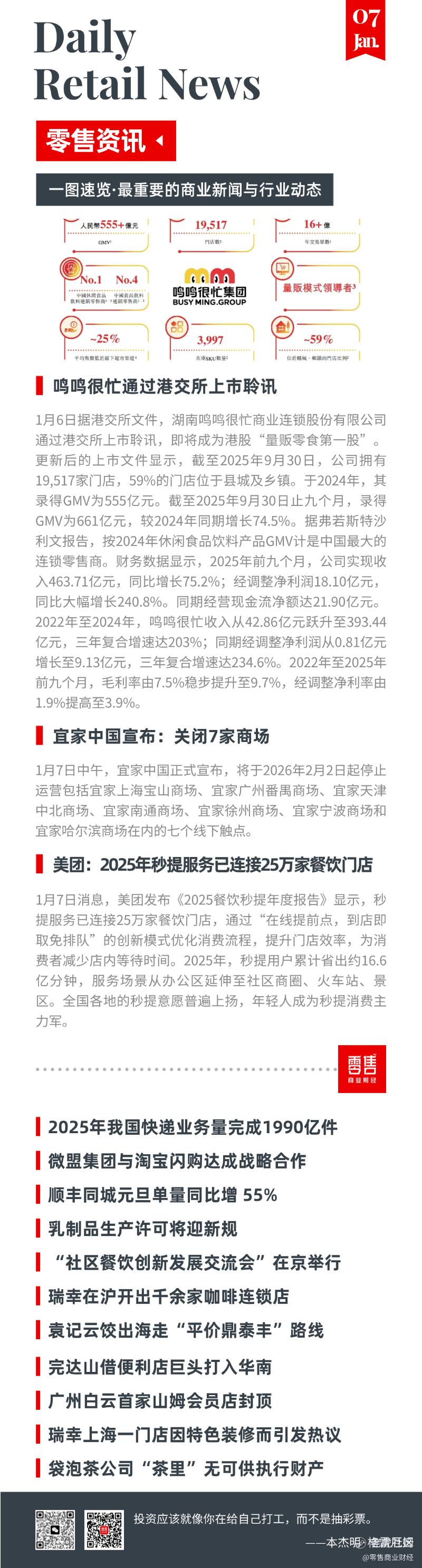 1月6日据港交所文件,湖南鸣鸣很忙商业连锁股份有限公司通过港交所上市聆讯,即将成为港股“量贩零食第一股”。更新后的上市文件显示,截至2025年9月30日,公司拥有19,517家门店,59%的门店位于县城及乡镇。于2024年,其录得GMV为555亿元。截至2025年9月30日止九个月,录得GMV为661亿元,较2024年同期增长74.5%。据弗若斯特沙利文报告,按2024年休闲食品饮料产品GMV计是中国最大的连锁零售商。财务数据显示,2025年前九个月,公司实现收入463.71亿元,同比增长75.2%;经调整净利润18.10亿元,同比大幅增长240.8%。同期经营现金流净额达21.90亿元。2022年至2024年,鸣鸣很忙收入从42.86亿元跃升至393.44亿元,三年复合增速达203%;同期经调整净利润从0.81亿元增长至9.13亿元,三年复合增速达234.6%。2022年至2025年前九个月,毛利率由7.5%稳步提升至9.7%,经调整净利率由1.9%提高至3.9%。