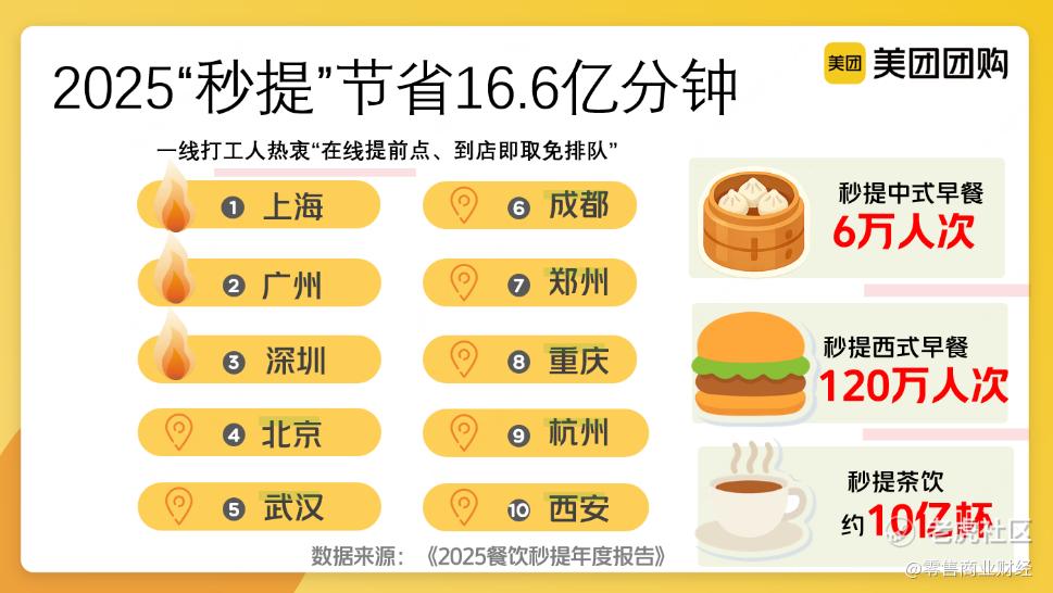 1月7日消息,美团发布《2025餐饮秒提年度报告》显示,秒提服务已连接25万家餐饮门店,通过“在线提前点,到店即取免排队”的创新模式优化消费流程,提升门店效率,为消费者减少店内等待时间。2025年,秒提用户累计省出约16.6亿分钟,服务场景从办公区延伸至社区商圈、火车站、景区。全国各地的秒提意愿普遍上扬,年轻人成为秒提消费主力军。