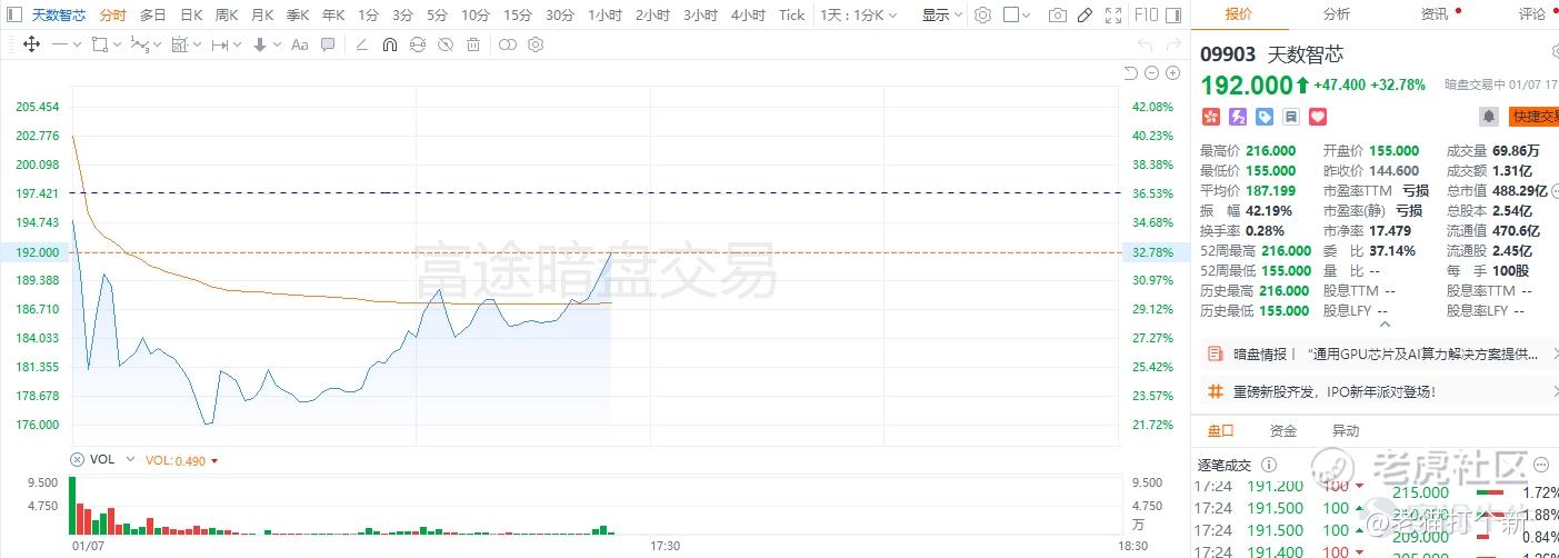 $天数智芯(09903)$ 作为GPU主流叙事,肯定没啥担心的,目前暗盘+30%这个涨幅都已经算低于预期了,按25年预期算,天数现在PS也就68倍,和壁仞的80倍差距大着呢,不过公司之间毕竟有差距,策略暗盘首日出手都可以,暗盘仍是有锚定在抛售的,首日机构买的可能多一些,不过首日也仍以拉高速走为主,个人参考看冲下500亿市值。