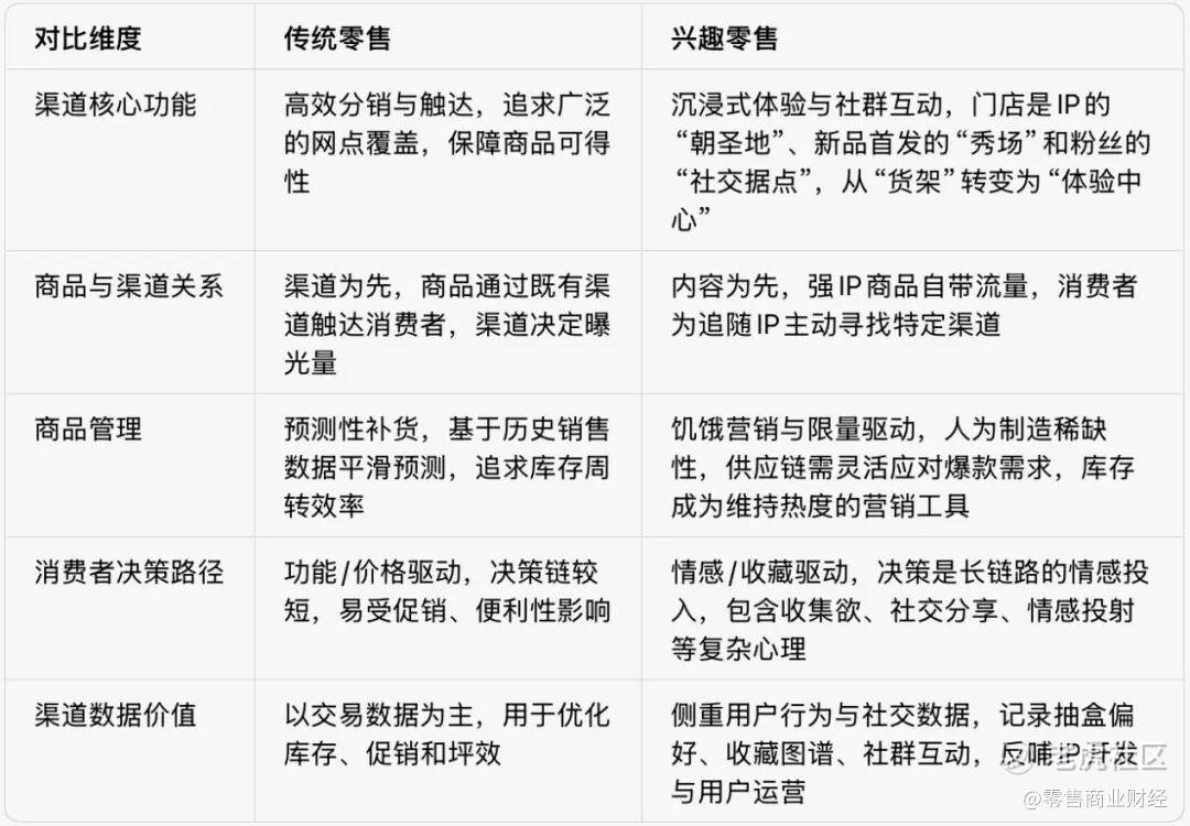 由此可见,我们不能用传统零售的逻辑来解读兴趣零售。从渠道运营的本质来看,两者存在根本性差异:传统零售的核心是“渠道驱动销售”,而兴趣零售则是“内容驱动渠道”,其渠道不再是简单的商品流通管道,而是“IP体验的延伸触点”。