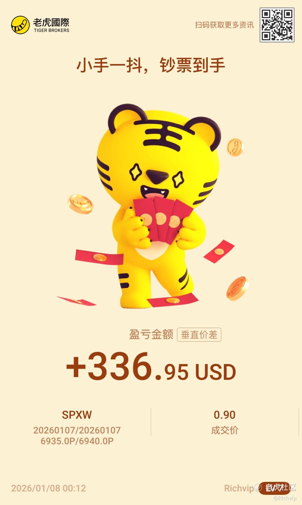 今晚开盘一直等待方向🧭,在ADP数据公布后用价差策略果断看多;2000刀保证金,30分钟收取权利金336.95刀,年化收益高达6149%。洗洗睡,晚安!