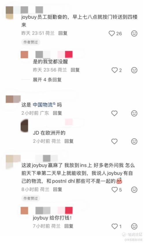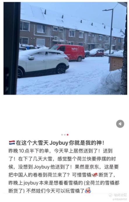 多位在荷兰的华人网友表示,寒潮来临当天,荷兰全国交通停摆的情况下,自己通过 Joybuy 下单的商品甚至在第二天一早提前送达。