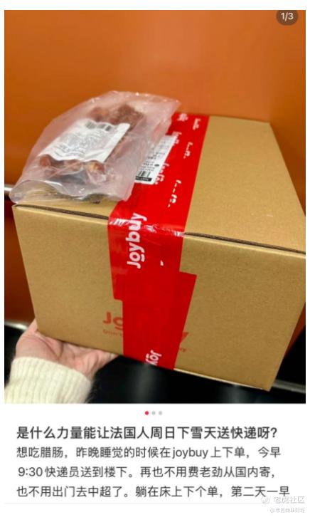 坐标德国、法国等地的网友也纷纷分享类似的购物体验。一位在德国生活的网友发帖分享称,尽管当地出现降雪天气,自己前一天晚上9点在Joybuy上下单的电视依然在第二天一早就送货上门,“在德国太久没有享受到次日达的服务了,Joybuy 做到了”,并表示快递小哥“服务很不错”,还帮忙搬上楼。