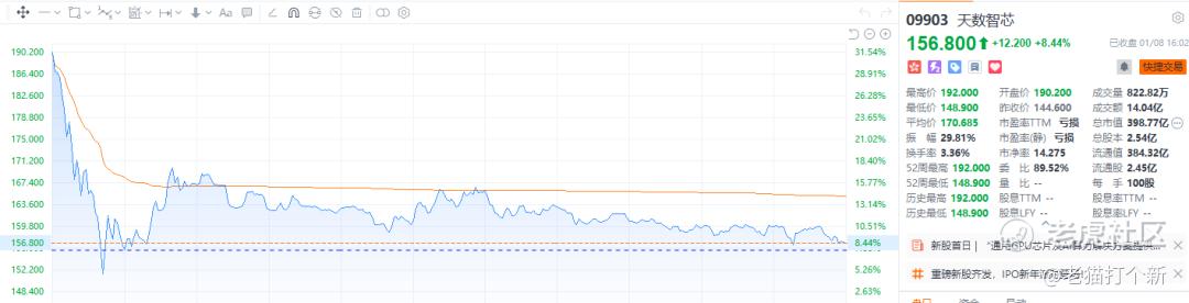 【天数智芯】昨天写文时天数其实只是开V,没到500亿,但后面暗盘已经两次达到了196.6(500亿市值线),futu收盘198.2,但是今天表现很一般,开盘只有192一路泄下来了,在400亿市值线防守,估值比壁仞仍低一大截。