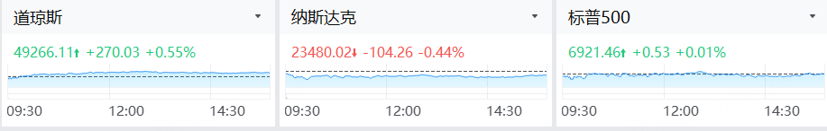 美东时间周四,美股三大指数收盘涨跌不一。截至收盘,道指收盘上涨270.03点,涨幅为0.55%,报49266.11点;纳指跌104.26点,跌幅为0.44%,报23480.02点;标普500指数涨0.53点,涨幅为0.01%,报6921.46点。
