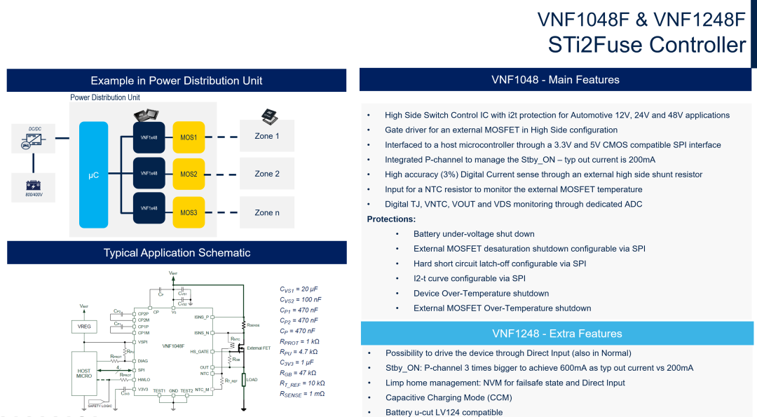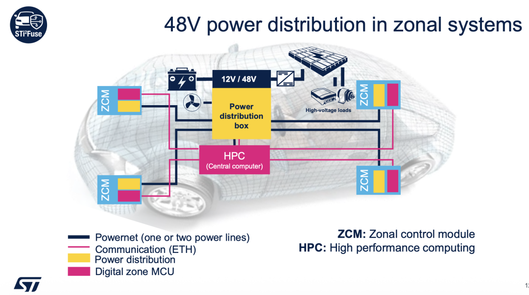 48V 的普及背后,离不开半导体技术的突破。以意法半导体(ST)为例,其在 48V 系统中推出了高性能 MOSFET、电源管理芯片和车规级 MCU,可有效降低开关损耗、提高功率密度,并为“中央计算+区域控制”架构提供坚实的底层支持。