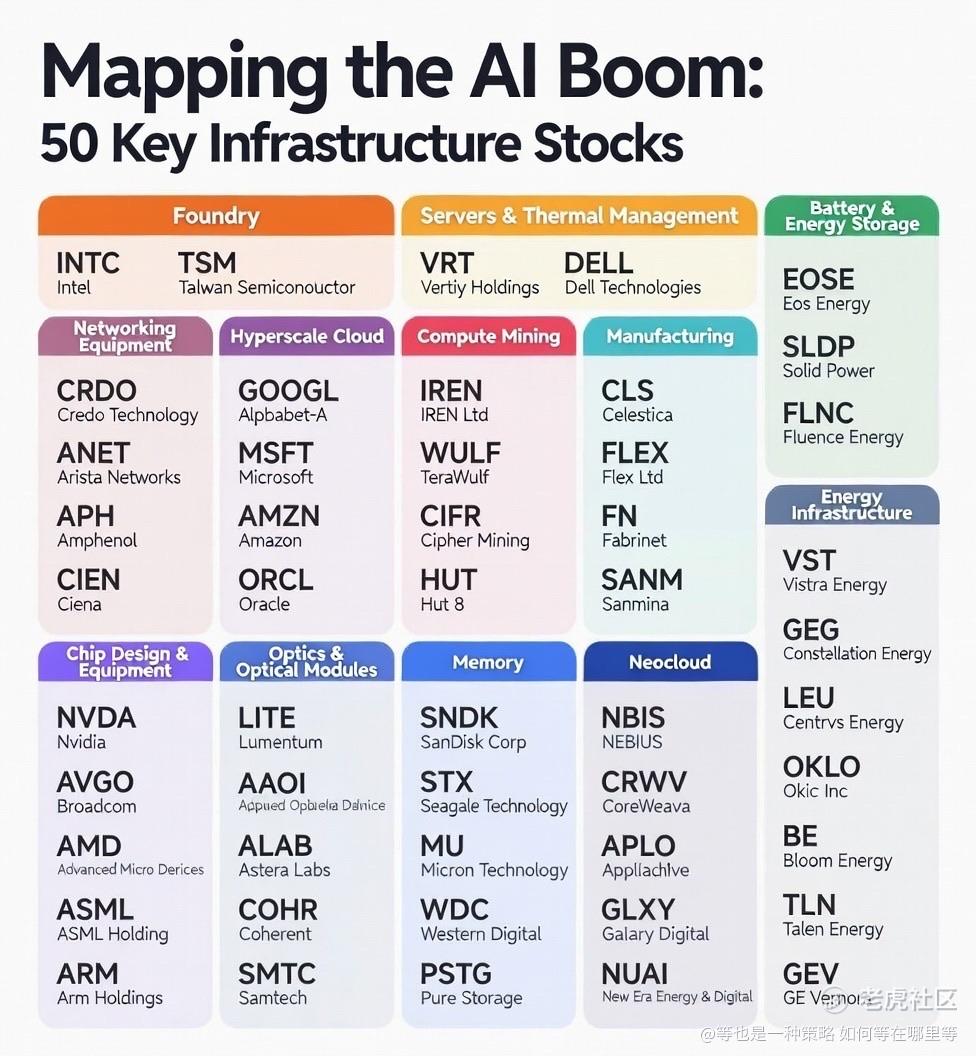 $MU、$SNDK、$WDC、$STX、$PSTG 让 AI 不只是“算”,而是“记得住”。训练数据、推理调用、历史上下文,都在这一层。没有存储,AI 只是短暂闪现的计算火花。