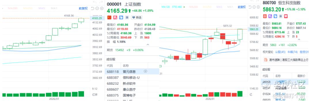 这也符合港/A的大势,上证指数自12月31日起已经6连阳,累计上涨5%;恒生科技指数虽然也有回调,但也有回踩后上行的迹象。