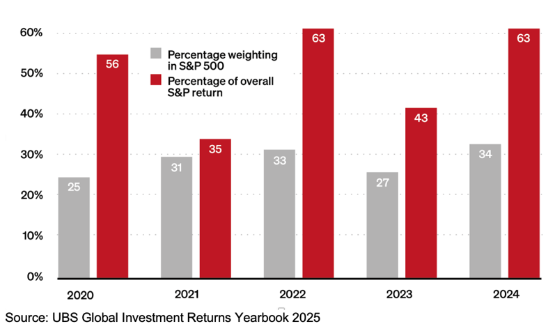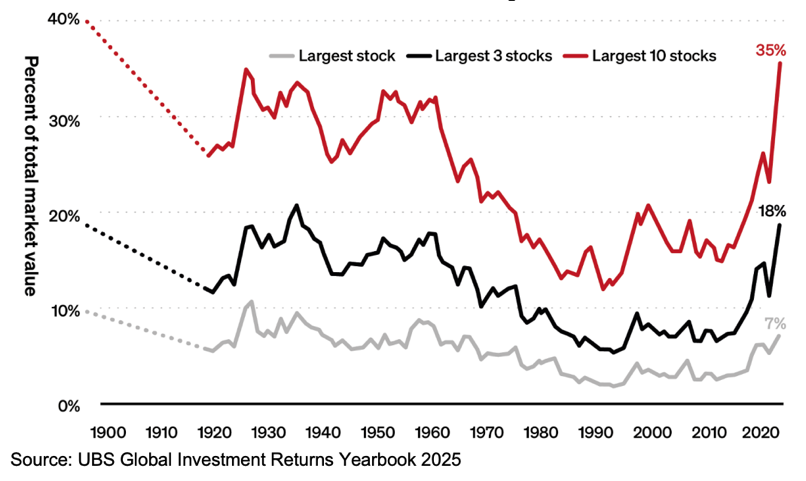 这一趋势在2025年仍在延续。到2025年底,前十大股票已占标普500指数市值的39%,并贡献了该指数以美元计50%的总回报。