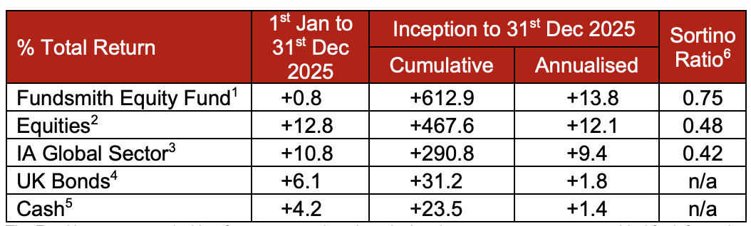 其执掌的Fundsmith旗舰基金Fundsmith Equity Fund年度涨幅仅有0.8%,而作为对照的MSCI世界指数(以英镑计、股息再投资)在2025年上涨了12.8%。
