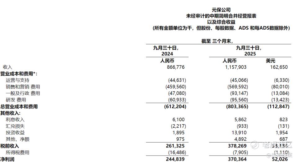 本季度运营与支持费用同比仅增0.9%,营销费用增长23.9%,均低于收入增速。这表明元保找到了更高效的获客与运营方式,并非单纯依靠投入驱动增长。