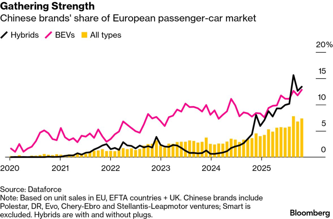 根据欧洲汽车制造商协会(ACEA),2025年上半年,中国制造的汽车在欧盟的销量占比将达到6%,下半年基本也是维持在6-7% ,高于2024年同期的5%,欧盟本土制造商将占欧盟汽车总销量的74%。