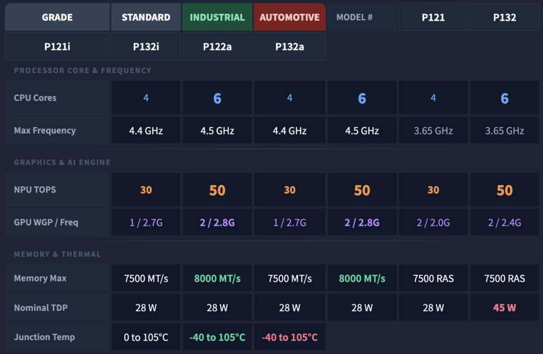 这是一套专门为功耗、体积和实时性受限的边缘系统设计的嵌入式处理器平台,采用 Zen 5 CPU + RDNA 3.5 GPU + XDNA 2 NPU 的异构架构,在单芯片上提供最高 50 TOPS 的 AI 加速能力,相比上一代实现了约 3 倍的 AI 性能提升,同时 GPU 图形渲染性能提升约 35%,并支持实时 4K/8K 视觉处理。