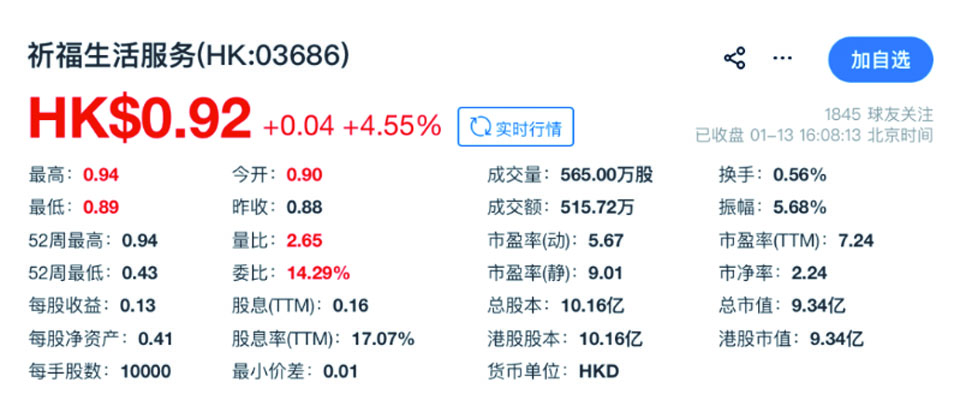 最新股价显示,截至1月13日收盘,祈福生活服务股价为0.92港元/股,涨幅4.55%,总市值仅9.34亿元。
