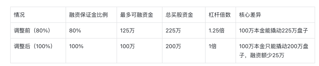 对于新开融资合约(含新开户、新加仓),购买力下降:同等自有资金下,能借的钱变少,总买入规模缩水。比如100万本金,之前能买225万股票,现在最多200万,少了25万“杠杆弹药”。