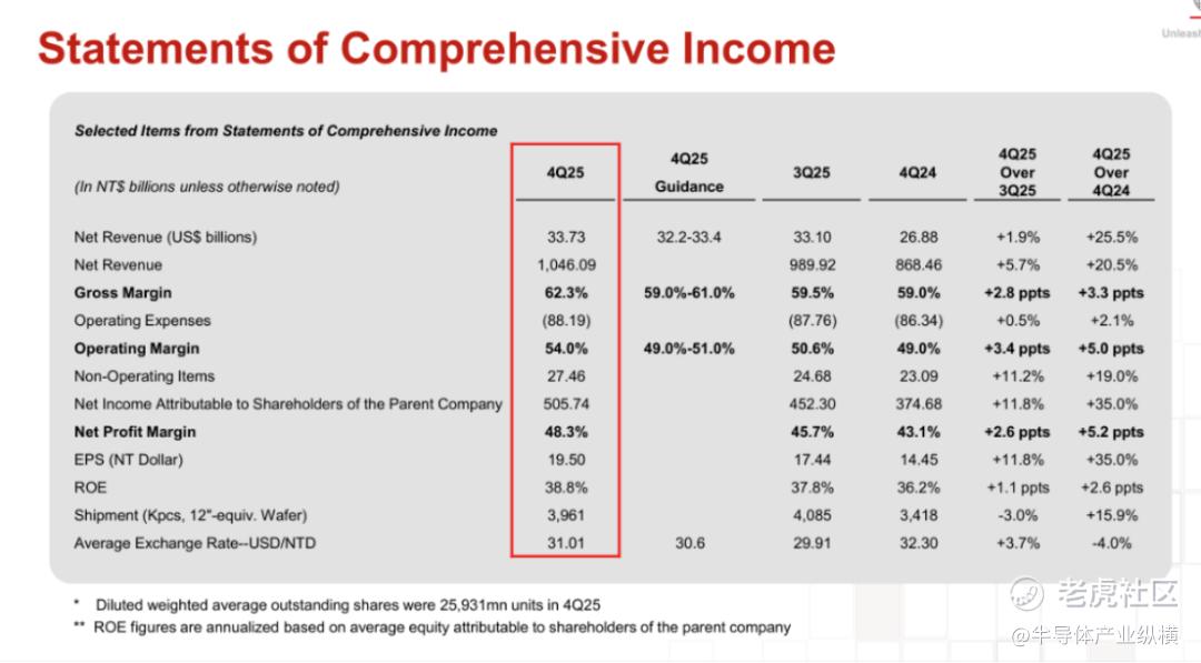 2025年Q4,台积电营收336.7亿美元(10460.9亿新台币),同比增长25.5%,环比增长5.7%。净利润5057.4亿新台币,同比暴增35%,这是台积电连续第八个季度实现利润同比增长。净利率达48.3%,毛利率62.3%。
