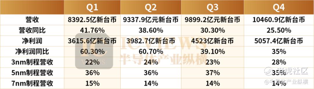 结合本次披露的 Q4 营收数据,可完整梳理出2025 年全年营收情况,台积电全年营收1224.2亿美元,同比增长35.9%;EPS 66.25新台币,增长46.4%。