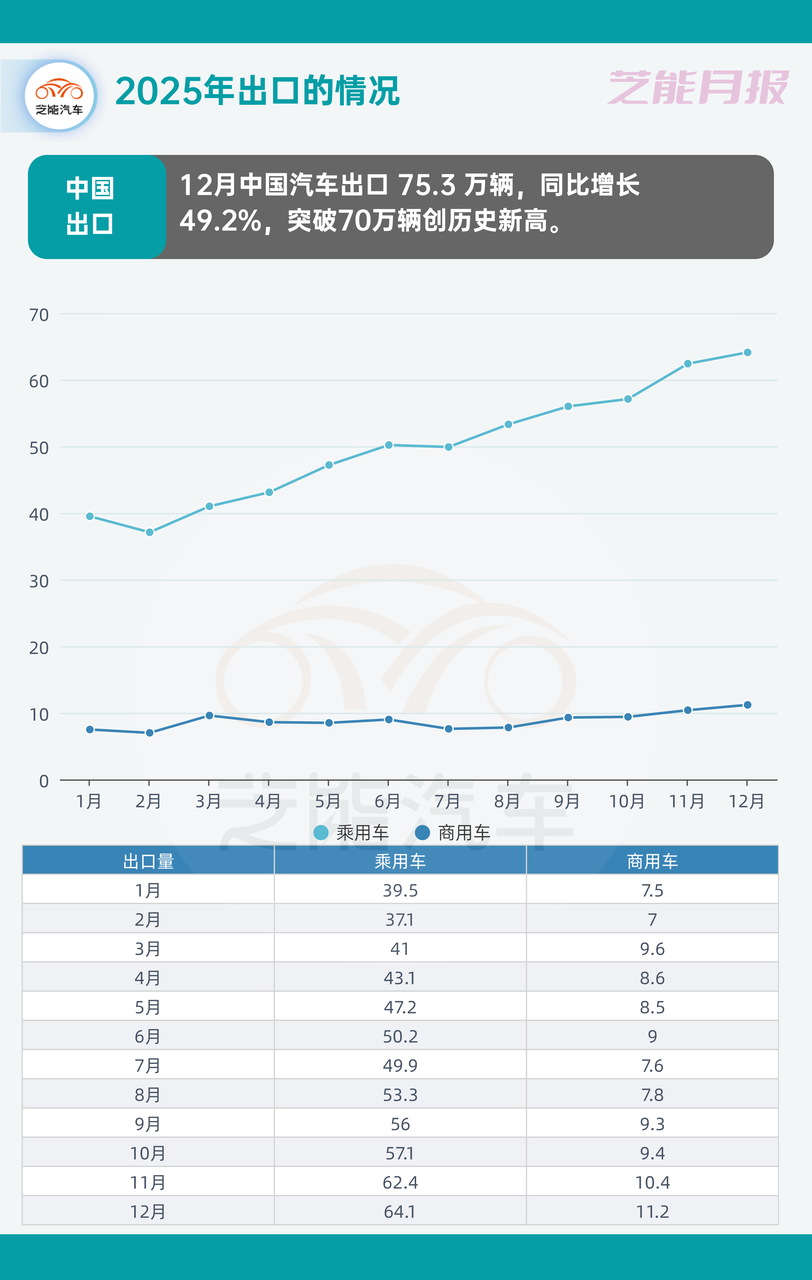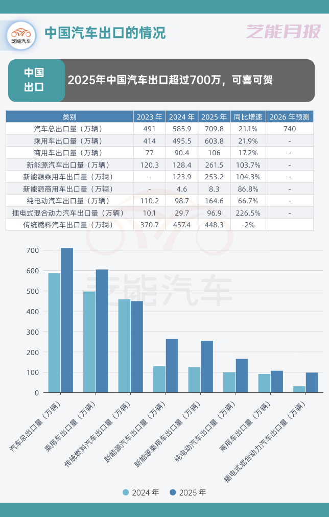 2023 年出口 491 万辆,2024 年增至 585.9 万辆,2025 年进一步提升到 709.8 万辆,同比增长 21.1%。