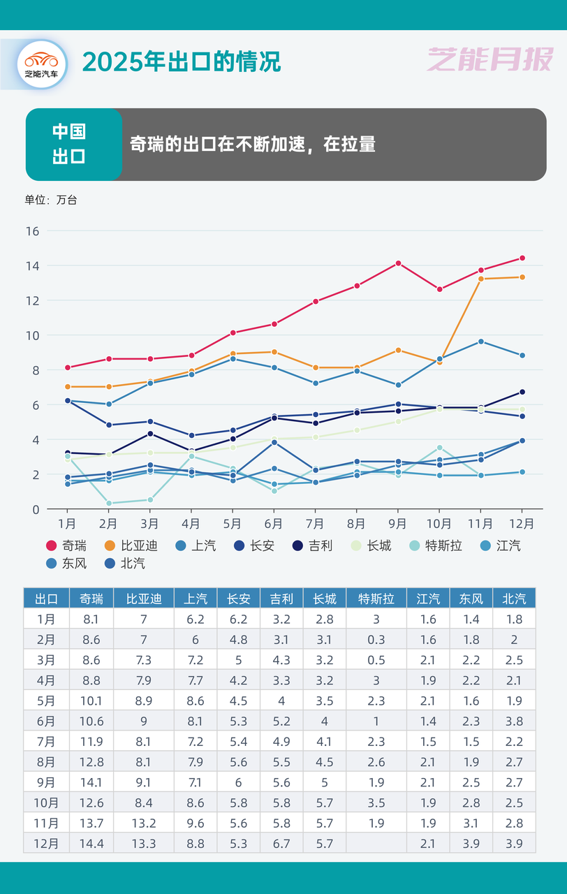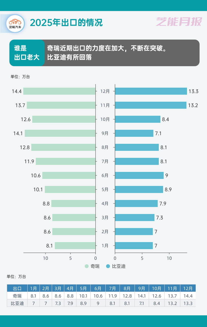 奇瑞和比亚迪的差距只有1.1万台了,2026年两家企业的出口竞赛会很激烈。