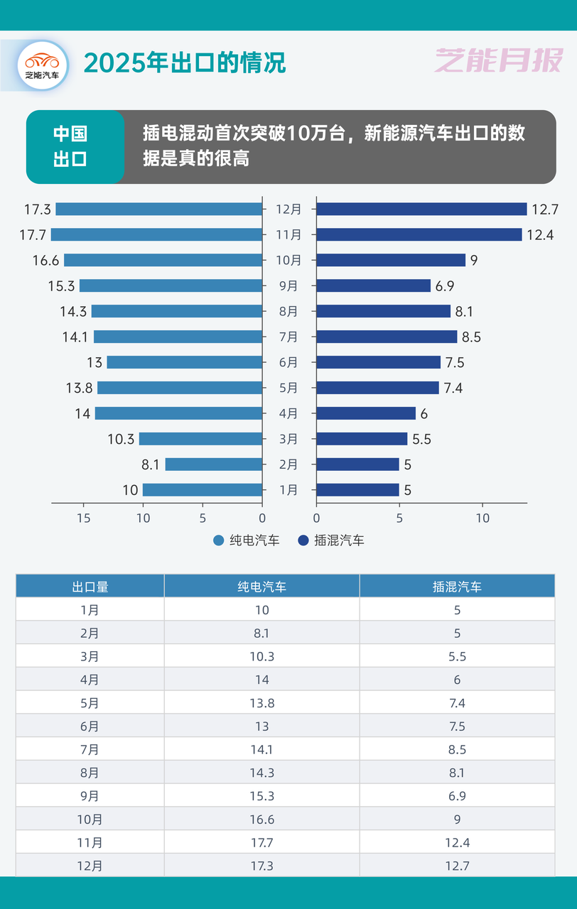 目前插电混动和纯电的数据开始靠近了,纯电17.3万,插电混动12.7万。