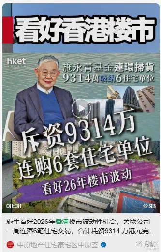 据公开信息,自2025年10月起,施永青透过旗下基金买入香港西环泓都、尖沙咀九龙站擎天半岛等共6伙住宅,扫货金额逾9314万港元。此前,中原地产相关微信平台曾释放施永青对2026年香港楼市持乐观态度的信息,也引发了市场更多猜测。