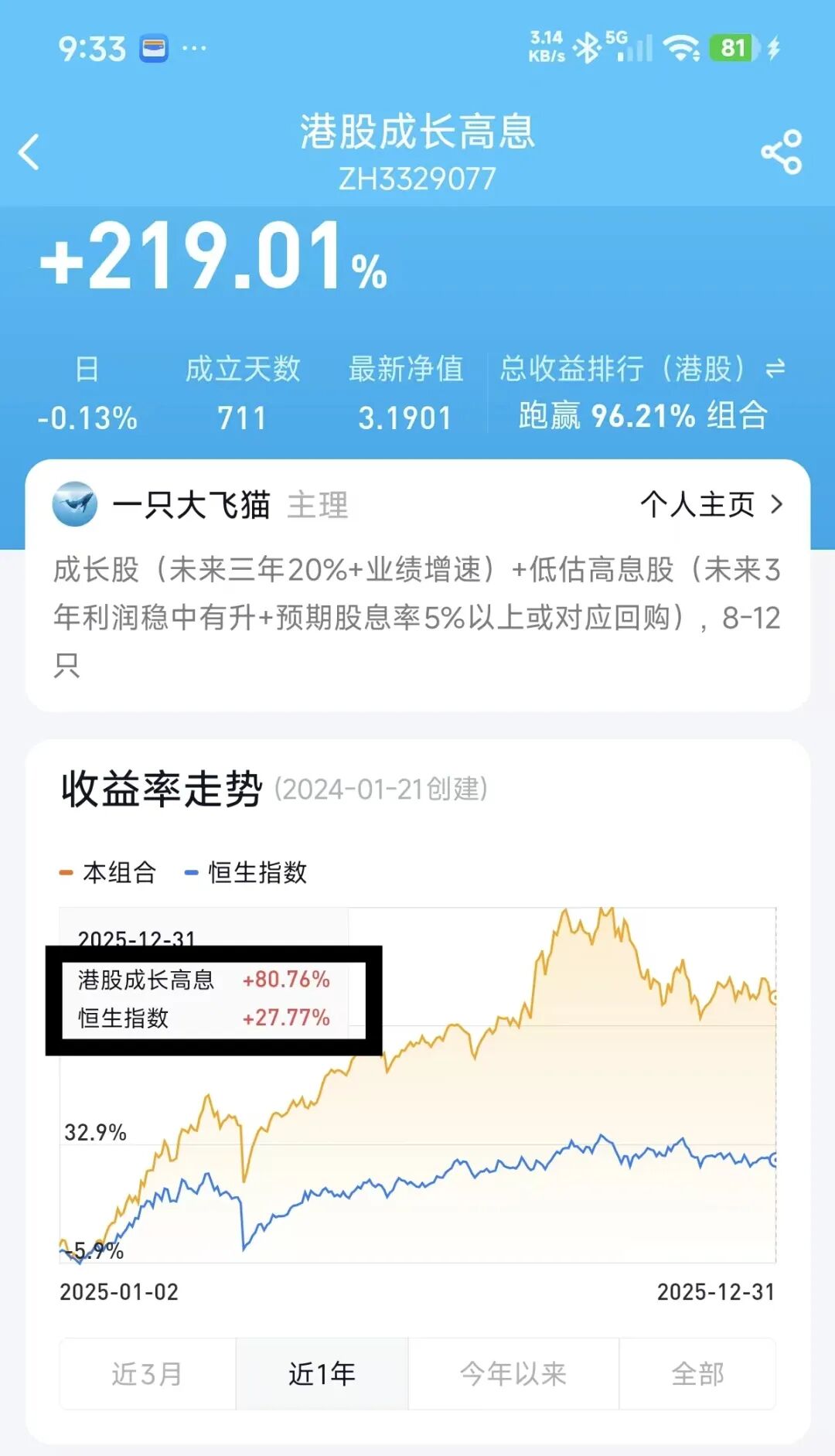 因为多账户持股(港股打新需要多账户),难以用券商的收益率统计,整体收益率只是毛估估。我在雪球有一个港股成长+高息的组合,近似实盘,2025年统计收益率大致是80%。