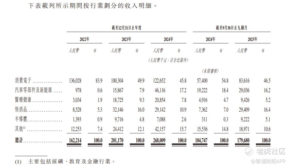 而从行业层面看,翼菲科技收入稳健增长的背后其实也是公司不断加速多元行业拓展的结果。在 2022 年中,翼菲科技的收入主要来自于消费电子领域,占比高达 83.9%。而至 2024 年,翼菲科技来自消费电子领域的收入占比下降至 45.8%,而来自汽车零部件及新能源领域的收入占比则从 0.6% 提升至 17.2%,此外,来自医疗健康、快消品及其他领域的收入占比亦有明显提升。