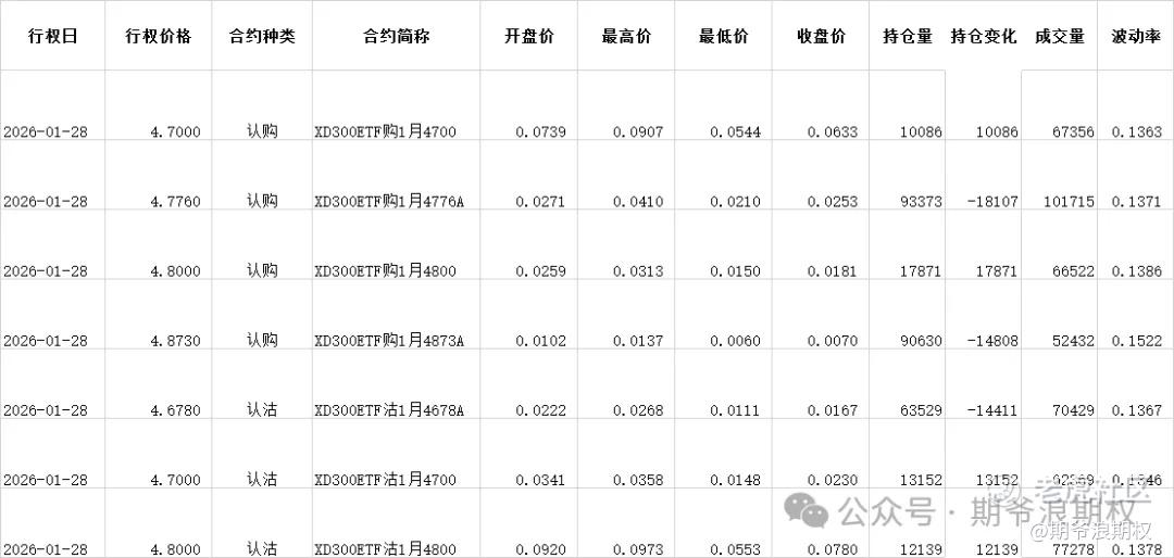 (1)沪深300ETF(沪)期权:1月最大持仓范围4776-4776,今收4.738,上涨0.04%。期权1月主力合约,认购有增有减,平值附近是分红后的行权价减仓,新增的整数行权价增仓,其他的是低行权价减仓高行权价增仓。认沽是是低行权价减仓高行权价增仓,减仓集中在4483-4678,合计2.0W张增仓集中在4700-4900,合计3.0W张。变化超过1W张的仓位如下: