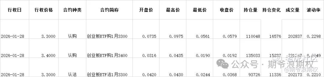 (3)创业板ETF期权:1月最大持仓范围3200-3400,今收3.318,下跌0.84%。期权1月合约,认购和认沽都是以增仓为主。认购增仓集中在3200-3500,合计4.1W张;认沽增仓集中2800-3500合计3.6W张。变化超过1W张的仓位如下: