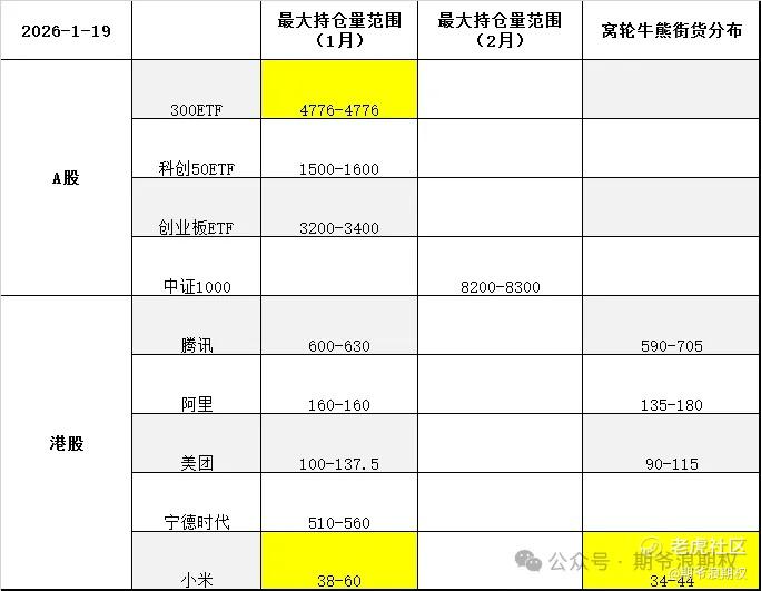 下图是今天大A的3个ETF和中证1000,以及港股的腾讯、阿里、美团、宁德和小米的最大持仓量范围以及窝轮牛熊分布范围,也就是1月和2月的期权筹码分布,黄色的表示跟上个交易日有变动。
