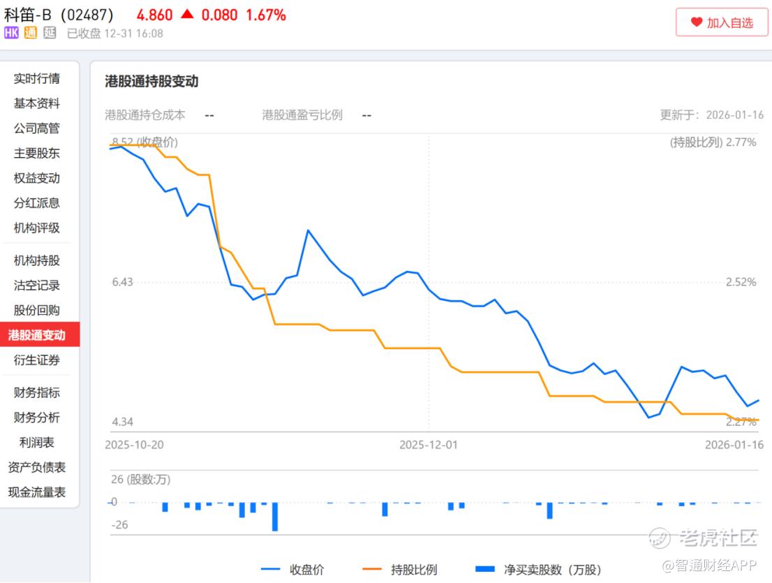 此后港股通对科笛的持股比例又在去年 10 月和 11 月进行了新一轮出清,11 月 11 日降至 2.45%,此后场内港股通资金再次放慢了流出速度,截至 1 月 16 日,其持股比例仍有 2.29%。