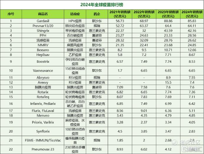 全球龙头企业辉瑞的同类产品(13价及后续上市的20价)长期占据全球疫苗销售榜首。数据显示,其Prevnar系列肺炎球菌疫苗(Prevnar 20&13)在2024年全球销售额就高达64.11亿美元。