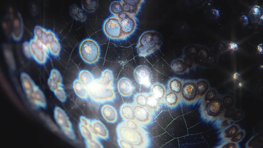 建盏之所以成为御用首选,除了审美上的“衬色”,更在于其卓越的物理特性。首先是保温:抹茶对水温极为敏感,建盏胎体厚实且含铁量高,具有极佳的蓄热性,这能让茶汤在寒冷的室内存温更久,从而维持汤花的稳定性——这在决定胜负的“斗茶”博弈中至关重要。其次是工艺之美: 曜变、兔毫、油滴……建盏在高温窑火中偶然析出的结晶,就像夜空中的星辰,这种“入窑一色,出窑万彩”的不确定性,恰恰契合了禅宗对“瞬间即永恒”的理解。