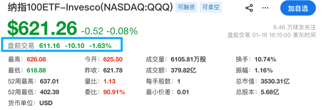 但是纳指盘前就跌的多了很多,我看了下,QQQ盘前已经跌了1.63%: