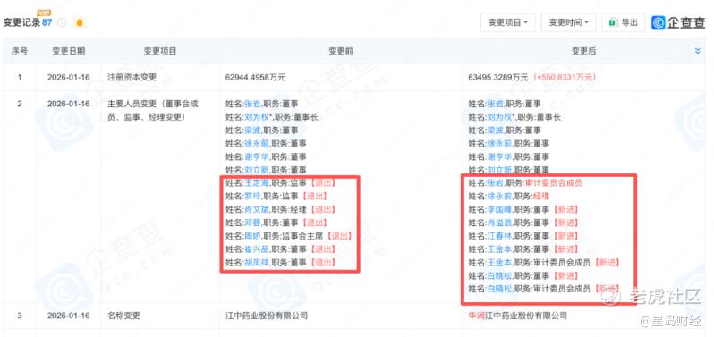 企查查显示,1月16日江中药业完成了名称变更,注册资本从约6.29亿元增加至约6.35亿元,增加了550.8331万元;同日还有七个主要人员职位进退,其中包括监事会3名成员、总经理肖文斌,以及胡凤祥、崔兴品、邓蓉三位董事退出,新进的则包括经理徐永前、两位审计委员会成员、5名董事。