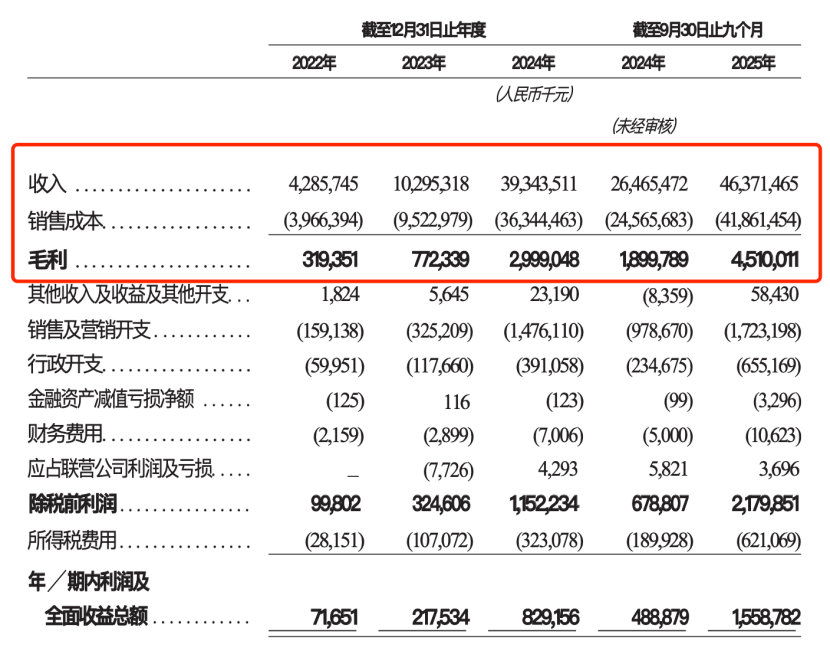 毛利:2022年3.19亿,2023年7.72亿元(+141.8%),2024年29.99亿元(+288.4%),2025年Q3 45.10亿元。