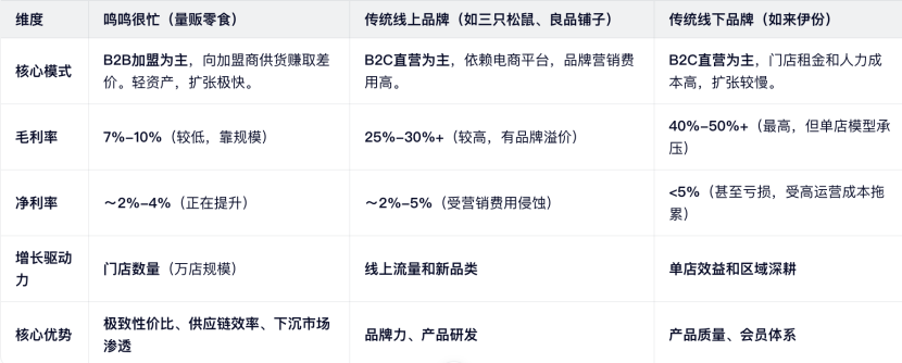 相对于传统零售(永辉、高鑫):鸣鸣的资产周转率(2024年总资产周转率达4.7)和ROE(16%)远超传统超市,说明其轻资产加盟模式效率极高。