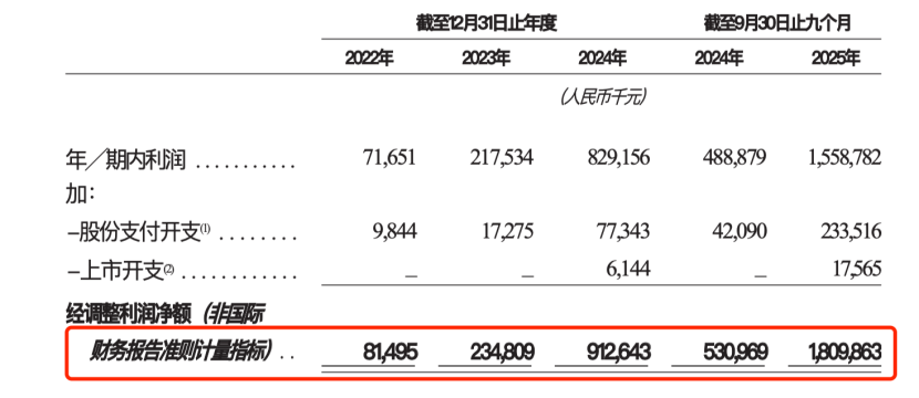 净利(经调整):2022年0.81亿,2023年2.35亿(+190.1%),2024年9.12亿(+288.1%),2025年Q3 18.09亿。