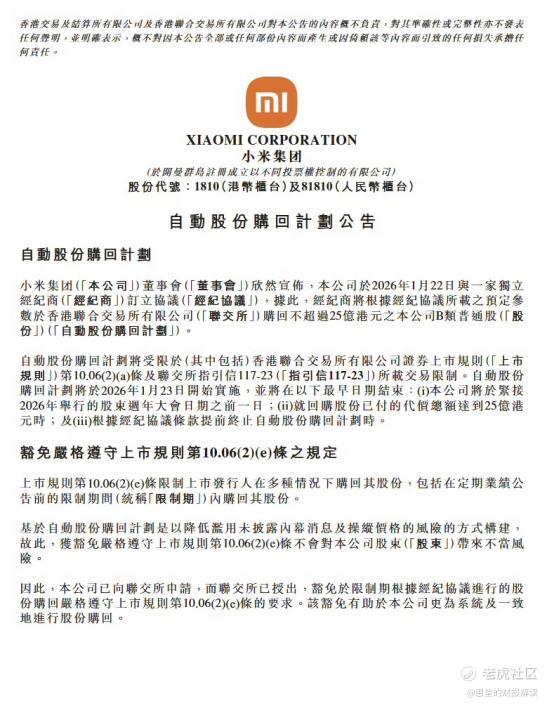 1月22日,小米公司首次推出25亿港元自动股份购回计划。围绕小米此次自动回购计划,市场上有一种声音认为“25亿港元不算多”。但如果真正理解港股自动回购机制的运作逻辑,就会发现,这种判断本身就忽略了关键背景。