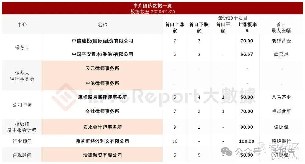 据**大数据统计,昆仑股份中介团队共计9家,其中保荐人2家,近10家保荐项目数据表现普通;公司律师共计2家,综合项目数据表现有待提升。整体而言中介团队历史数据表现中规中矩。