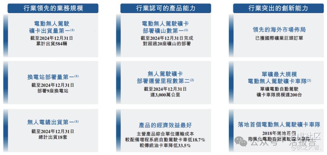 2024年,按出货量及收入计,公司是全球最大的纯电自动驾驶矿卡提供商;截至2024年12月31日,按采用公司解决方案的矿山累计数量计,公司是全球最大的电动及自动化矿山解决方案提供商。
