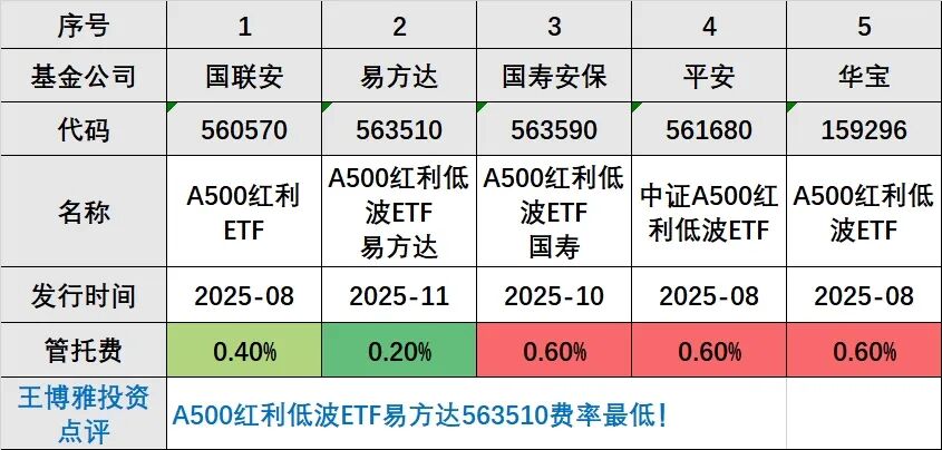 A500红利低波ETF易方达(563510)最良心,仅为0.2%,不愧是ETF费率杀手,值得夸奖。