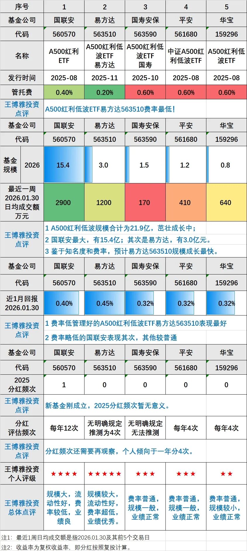 根据最重要的收益表现,同时结合费率,规模,流动性和分红频率等因素,我对5支A500红利低波ETF做出了如下个人评级: