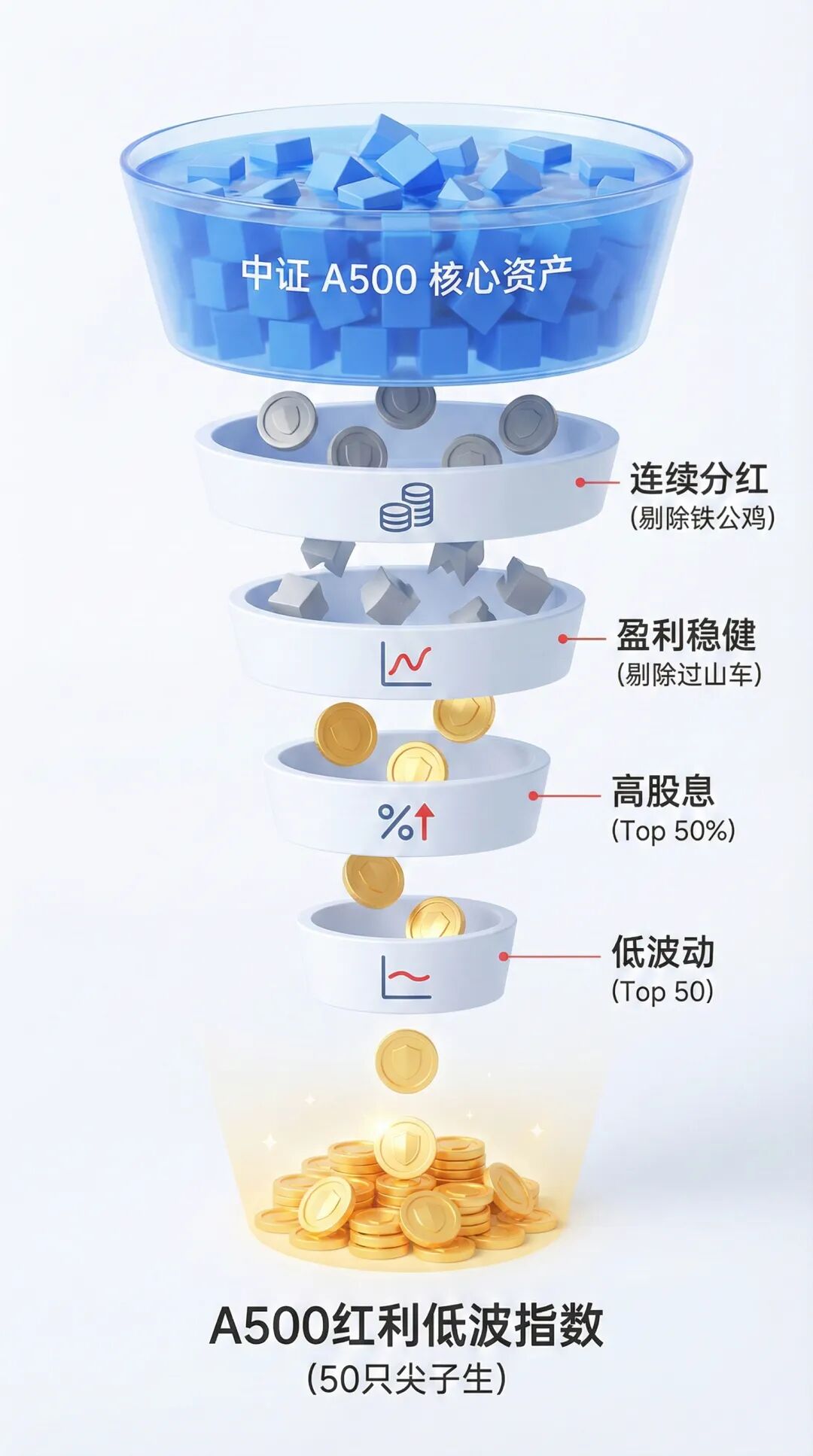 简单来说:它就是在“核心资产”这个优等生班级里,进一步优中选优,挑出了那50只分红最稳、波动最小的“尖子生”。