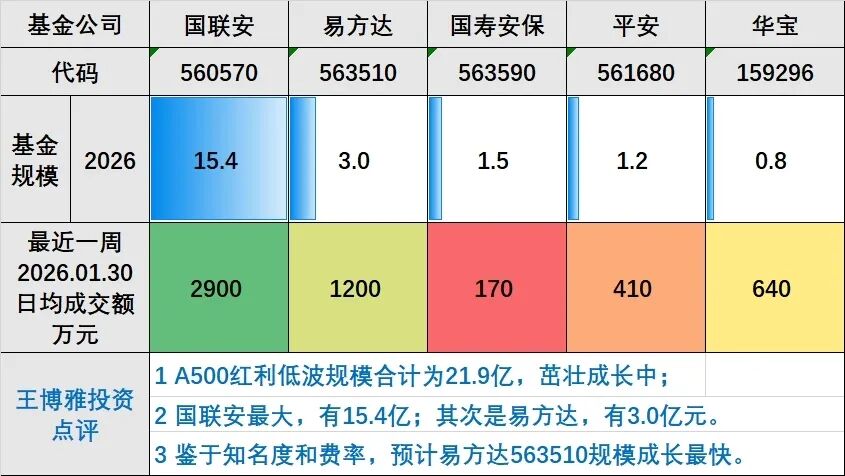 不过考虑到易方达的知名度、低费率和良好的管理水平,我个人认为未来最大的极有可能是A500红利低波ETF易方达(563510)。