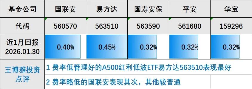 可以看到,A500红利低波ETF易方达(563510)近一个月表现最好,这源于其超低费率(0.2%)和优异的管理水平。